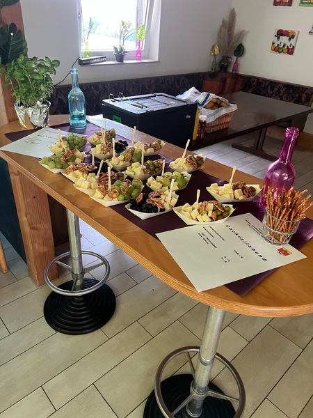 Kaltgetränke mit und auch ohne Alkohol wurden ebenfalls ausgeschenkt. Dazu gab es kleine Snacks mit Käse und Weintrauben zum Kaufen. Die Location wurde am vorherigen Tag fleißig mit Fahnen, Girlanden