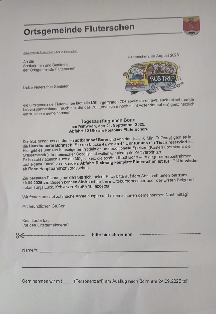 ,,Bönnsch“ist ein Brauhaus in der Bonner Innenstadt. 42 Senioren hatten sich zu diesem Ausflug am 24. September angemeldet und sie waren auch alle pünktlich zur Abfahrt auf dem Fluterscher Festplatz.
